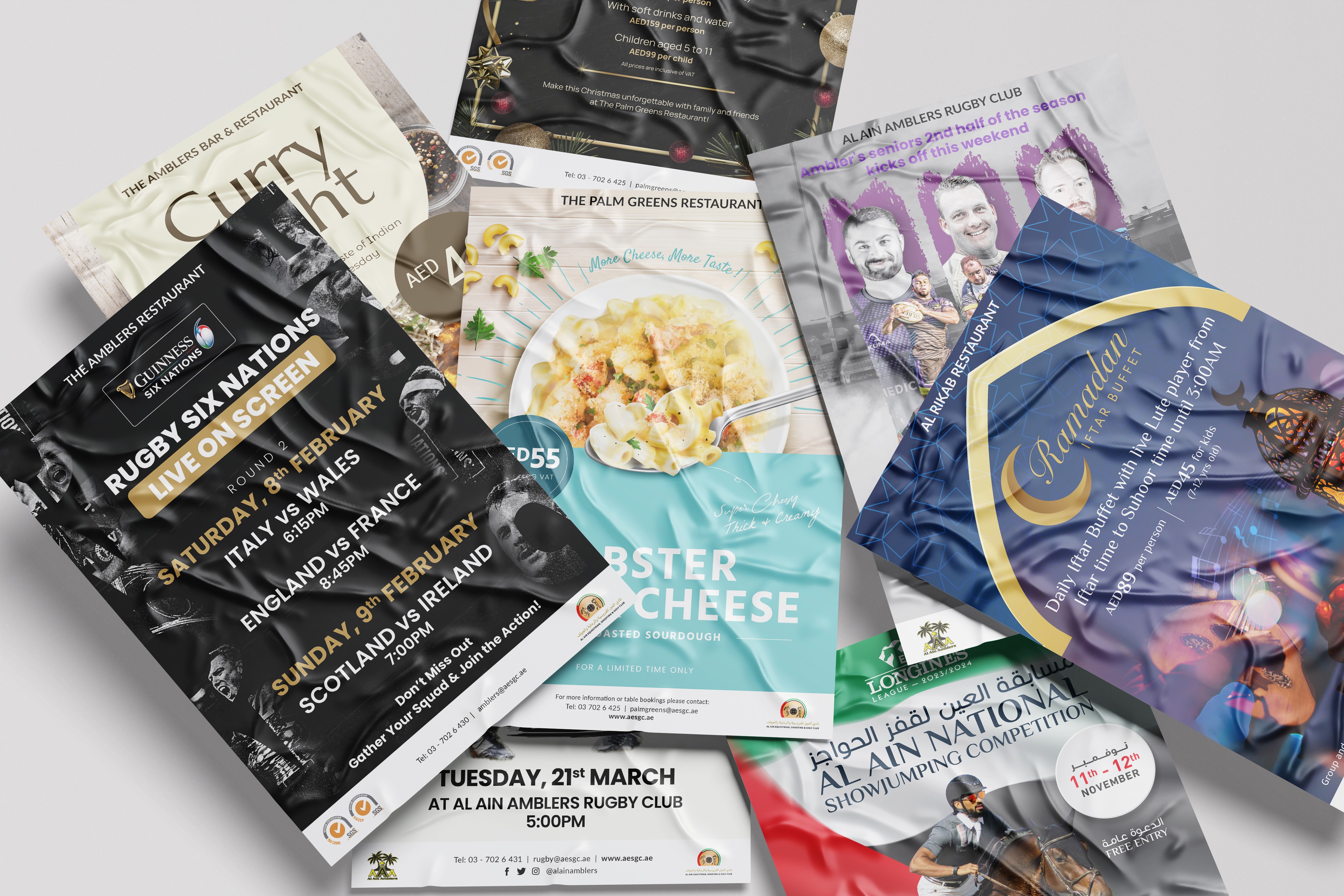 This project category showcases a range of print advertising and promotional designs created for food & beverage restaurants, golf clubs, rugby clubs, and shooting clubs.